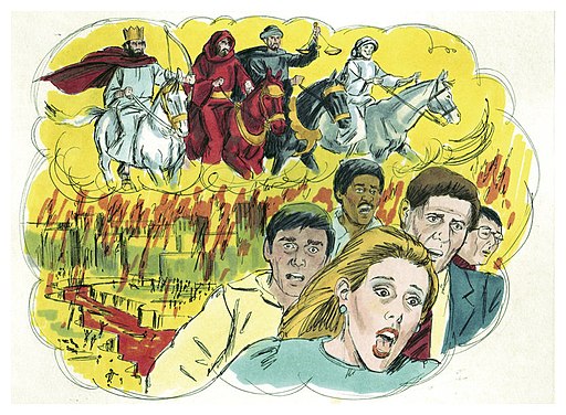 어린양이 넷째 인을 떼실 때에 나는 네 번째 생물이 “오라!”고 외치는 것을 들었습니다. 나는 창백한(푸르스름한) 말을 봅니다. 그의 기수 이름은 죽음입니다. 죽은 자들의 세계가 그들의 바로 뒤에 있었다. 그들은 전쟁과 기근과 질병과 짐승으로 세계 인구의 4분의 1을 죽일 수 있는 권세를 받았습니다.