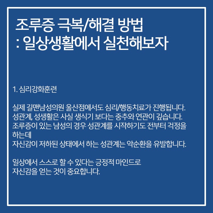 2. 심인성 조루치료 – 약물치료에서 개선약물치료는 항우울제를 사용하여 환자에게 사정하기 어려운 증상을 만드는 현상으로 조루증 치료방법의 목적으로 사용되었습니다 다만 약을 복용한다고 모두가 효과를 보는 것은 아니며 조루증 약인 프리레지나 네노마정의 조루약을 끊으면 원래대로 돌아갈 수 있습니다.단순히 약만으로는 심리적 안정을 찾을 수 있지만 본래 감각이 민감한 경우는 완전히 효과를 보기 어렵고 수술적인 치료나 꾸준한 자가치료 운동행동훈련까지 병행하는 것이 좋습니다. 조루치료제를 약 2~4주간 처음에는 매일 복용하면서 자주 관계를 가지면서 자신의 사정시간을 체크한 후 시간이 늘어난 경우 성관계를 2회에 1회 정도만 치료제 약물치료를 하면 됩니다.- 조루약은 전문의에게 처방받아 올바르게 복용해야 안전합니다.-