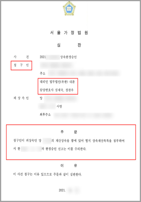 춘천변호사 “상속제한인정” 원상회복 + “배당절차” 완료사례